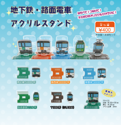 9月6日発売開始! アクリルスタンド 400円(税込) ホームページでは販売しておりません くわしく アクリルスタンド 札幌の地下鉄・路面電車がスタンドが連結できるアクリルスタンドとして新発売! 単体でも、つなげて飾ってもかわいい♪ ※カプセル自販機でのお取り扱いのため、種類はお選びいただけません。 400円(税込) 閉じる